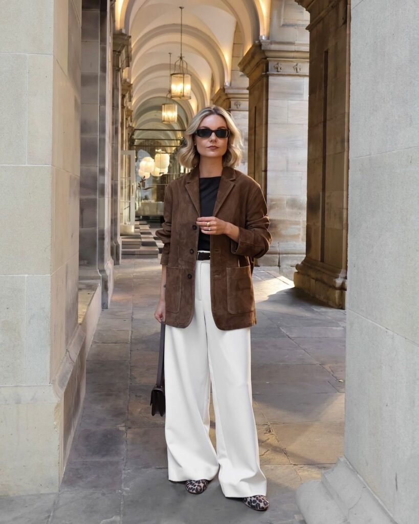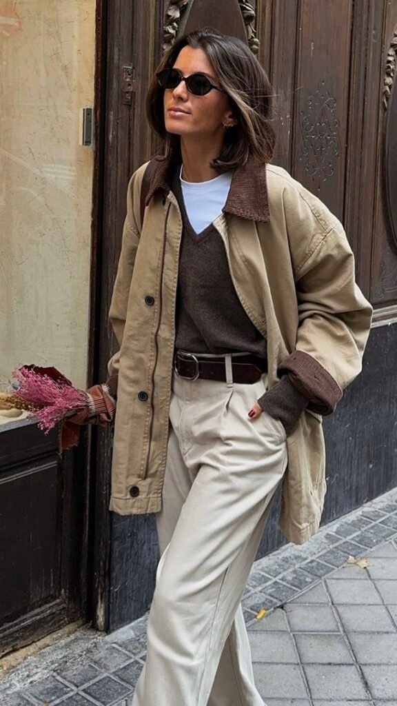 Fashion Tip: Invest in tailored trousers, oversized coats, and cashmere knits in shades of beige, cream, and soft grey. Layer with intention—each piece should complement the next in both texture and tone. Finish the look with simple gold jewelry or a structured belt to maintain polish without excess.