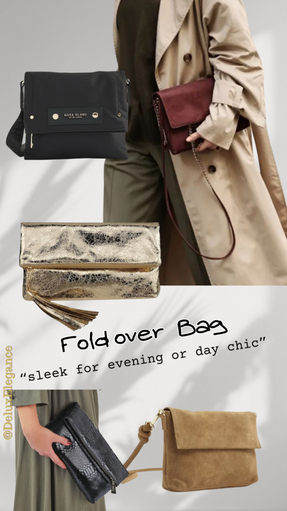 Jeans, a ribbed top and a long trench are suitable to wear as a foldover bag on daily outings. During evenings wear it with a silk blouse, leather trousers and heels.