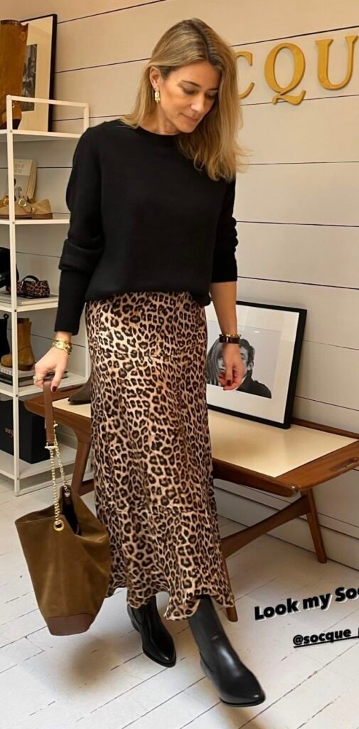 Throw on a pair of sassy pumps. The combination of a leopard print skirt, cozy sweater, and stylish pumps creates a balanced look that’s both chic and comfortable. Picture yourself at a fall festival, your outfit perfectly blending style and practicality as you enjoy the crisp air and vibrant autumn colors.