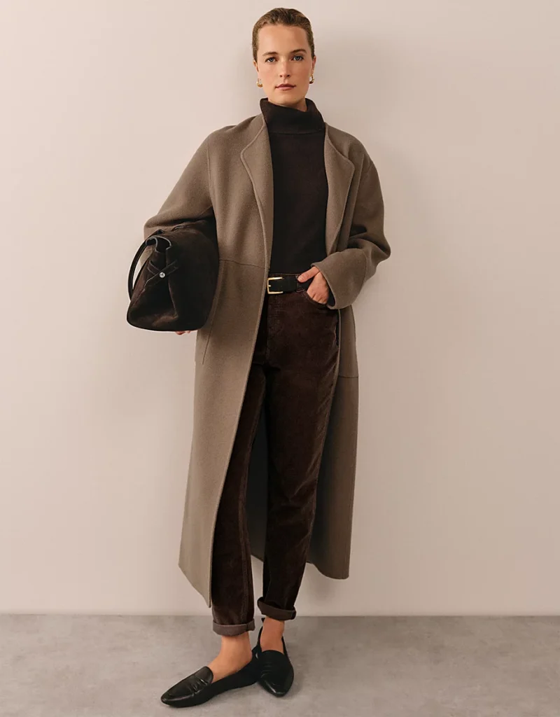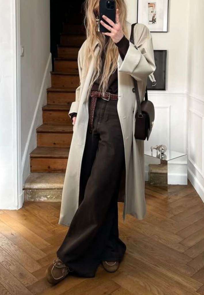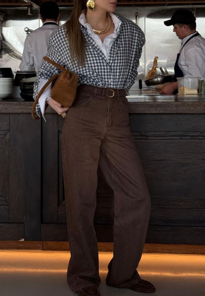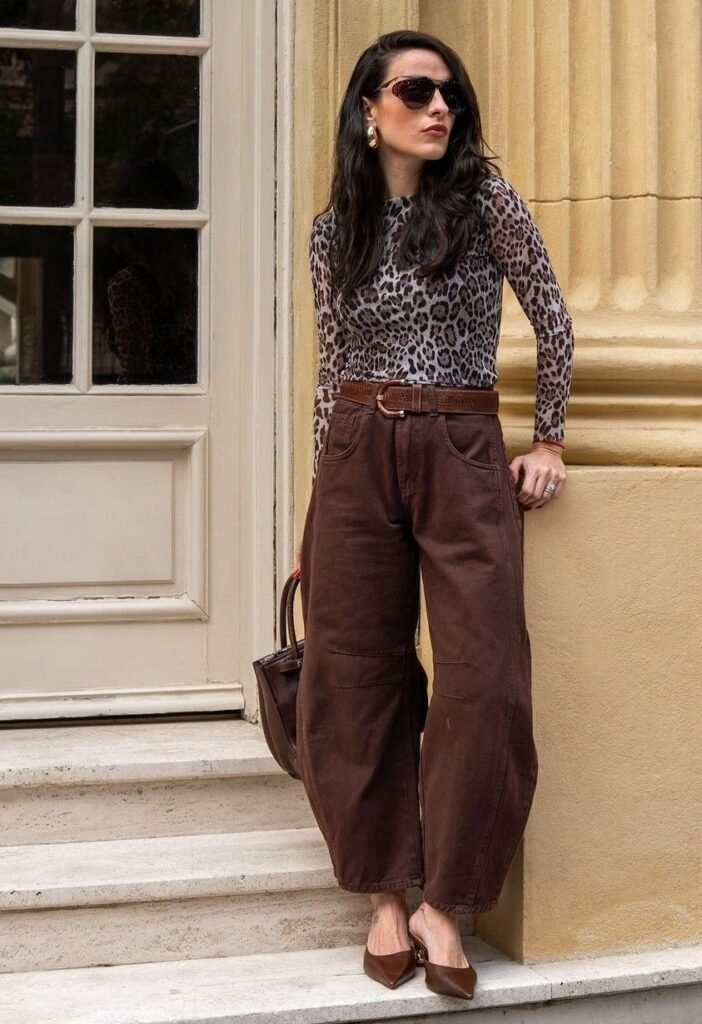Wear brown barrel jeans with a fitted ribbed top and neutral mules for a minimalist day look. For cooler days, layer on an oversized wool coat in beige or olive, and accessorize with a structured handbag for balance.