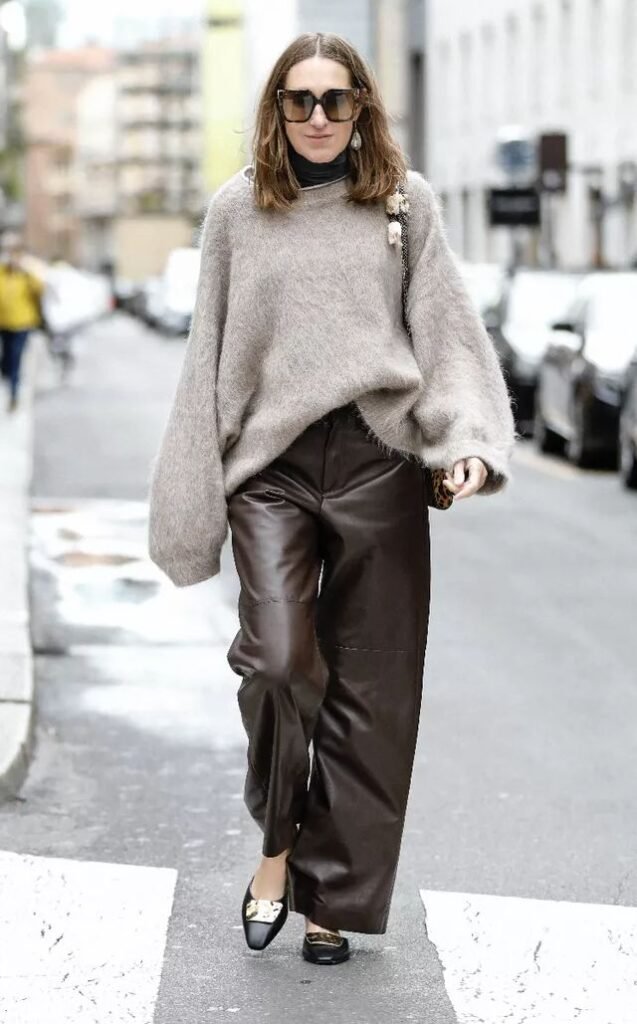 Pair them with a silky blouse or cashmere sweater for a contrast of textures. Finish with heeled boots and a tailored coat for an effortlessly sleek fall look. For an evening outfit, choose a fitted black top and statement earrings—perfect for modern sophistication.