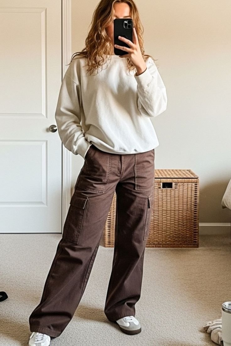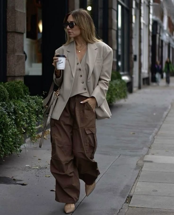 Pair brown cargos with a slim-fitting black top or neutral tank, and finish with heeled ankle boots for a refined yet casual ensemble. For a street-style spin, add an oversized leather jacket or cropped puffer and complete with chunky sneakers.